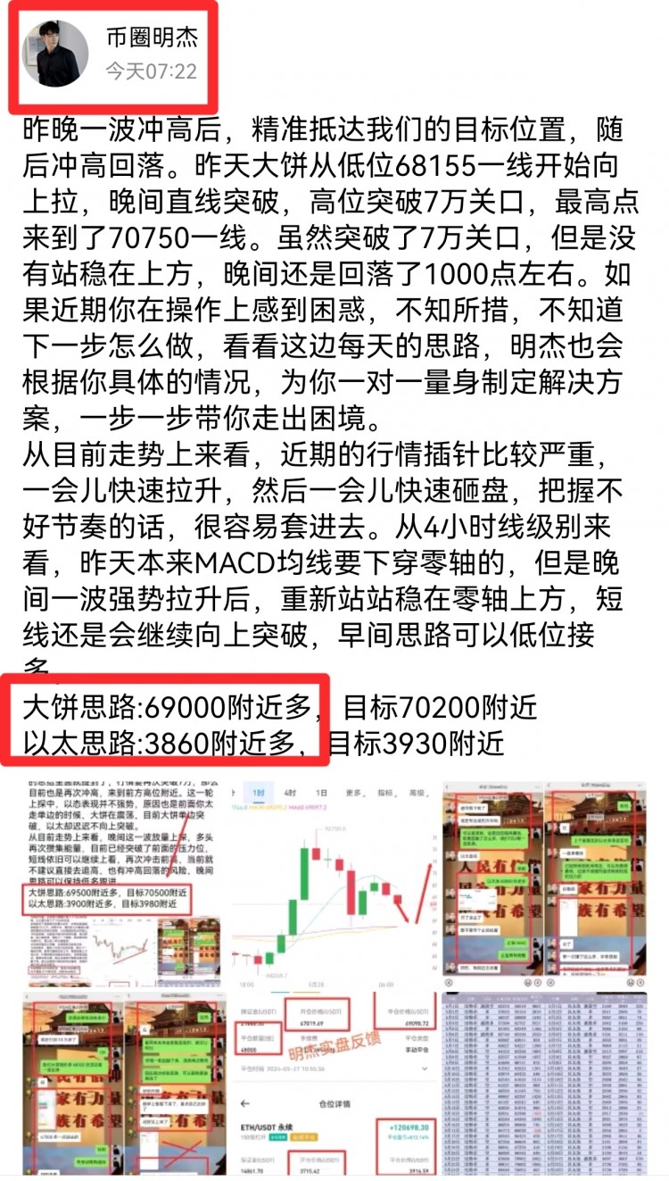 昨日晚间一波上探之后,大饼再次突破7万关口,但是这一波并没有站稳在上面,目前再次回撤下来。从4小时线级别来看,近期整体走势呈现上升的趋势,目前短线已经回落到短线支撑位附近,如果不破位的话,我们依旧可以低位跟多,每次在下通道的也会震荡,午后可以重点关注一下,这个斜切面的支撑,午后思路依旧可以保持低多参与。