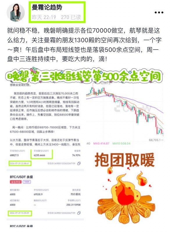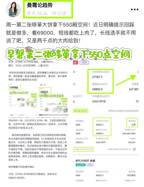 各位币圈的朋友晚上好!这里是你们的波段女神~曼霜!今日早磐曼霜明确提示上看祚哆,在经过上午拉盘后形成多阻上攻走势,而曼霜也是给到提示上看69000附近位置,后来到晚间大饼在虚破70000后滞涨,从盘面的得知在受高位压制后强势回落,午后曼霜的帖子中也给过大家提示70000附近直接做空看67500附近,这近2500殿的空间你又吃到了多少呢!周一曼霜石磐也是哆箜双吃拿下2000余点空间,姨太没有大饼给力签吃一点也是知足的!