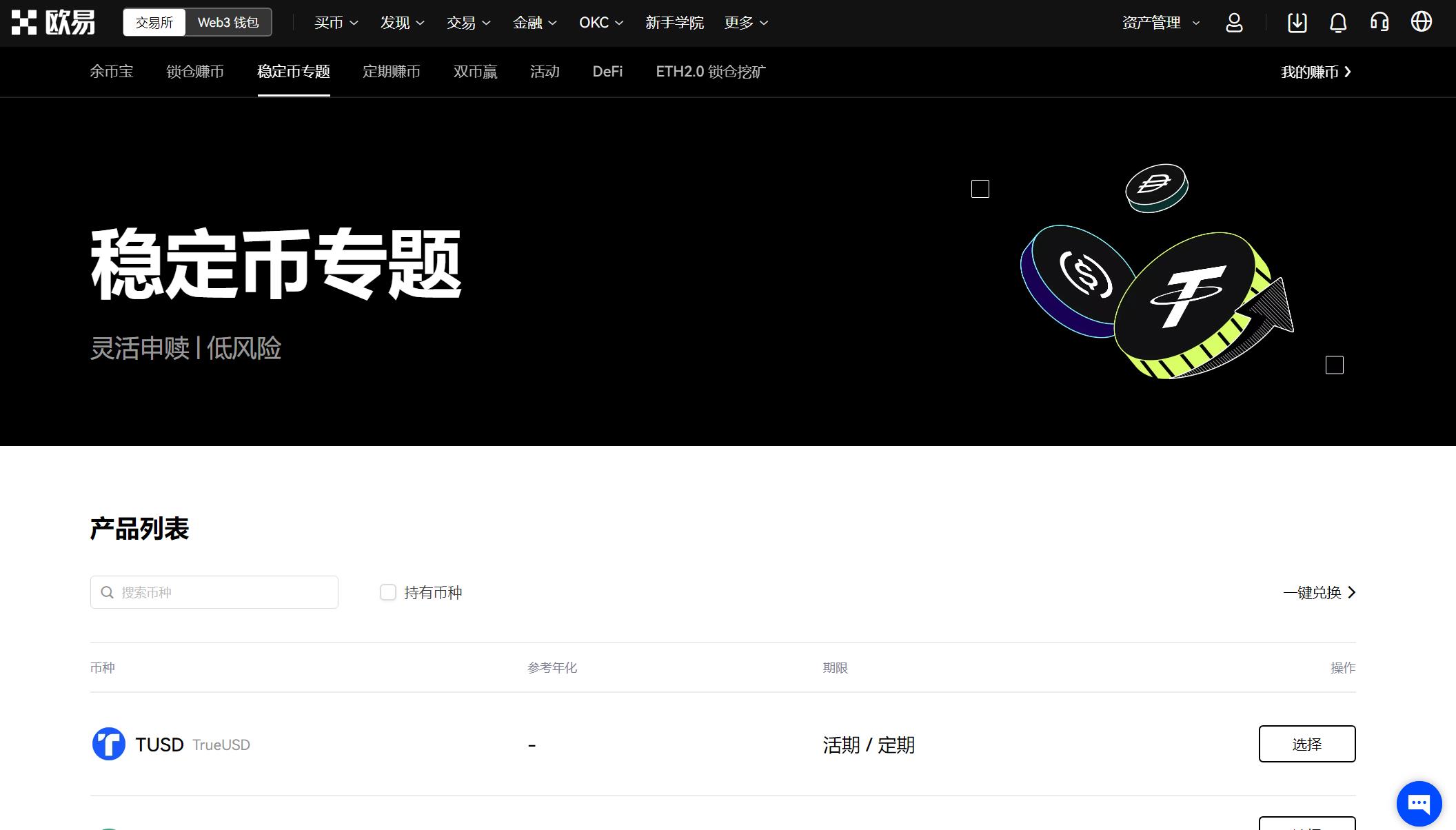 稳定币赚币是一款专门针对稳定币的产品,聚合了余币宝、DeFi等不同项目下支持的稳定币。