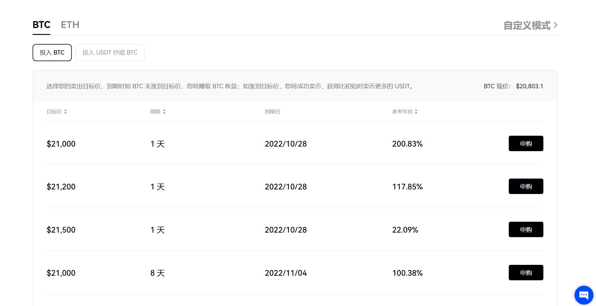 | 到期日价格 < 目标价 | 投入金额 * (1+ 收益率) | BTC(或者 ETH) |