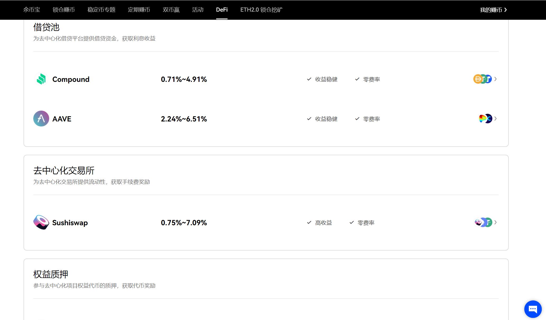DeFi服务是欧易打造的一款帮助用户快捷参与链上DeFi项目获取奖励的工具产品。DeFi,即Decentralized Finance,去中心化金融。指基于区块链和智能合约构建的去中心化金融服务,包括借贷、去中心化交易所、去中心化保险、稳定币等,目前具有代表性的DeFi产品有 Sushiswap、Compound、AAVE等。