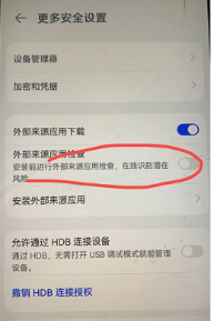 ②设置”-“安全与隐私”-“更多安全设置”,关闭“外部来源应用下载”