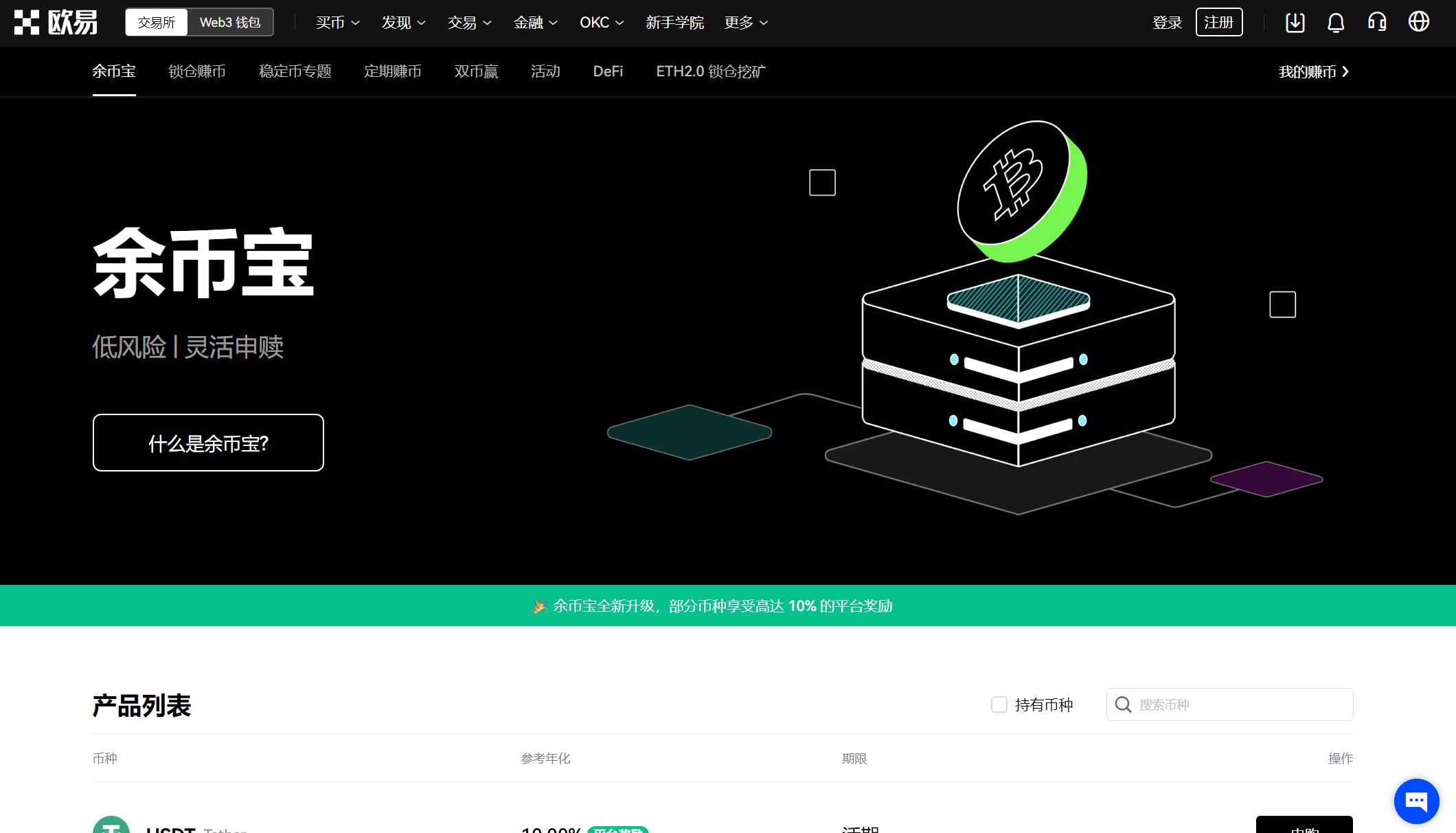 登录欧易OKX官网,点击左上方金融业务,选择赚币,即可进入赚币页面。