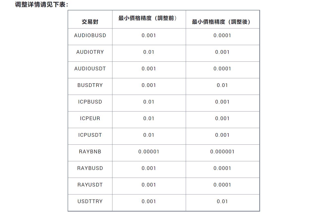 API同步更新,API用戶可以通過GET /api/v3/exchangeInfo 查看最新價格精度。詳情請參考:API 文檔;