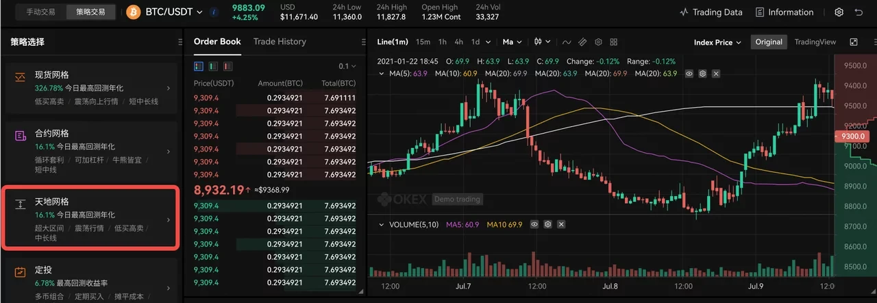 天地网格是一种现货网格策略,在特定价格较大的区间进行低买高卖的自动化交易策略,系统会帮助构建出一系列的买卖价位。