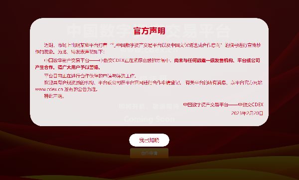 2月20日,中国数字资产交易平台(中数交CEDX)在官网发布公告称:“市场上出现某些平台打着‘与中国数字资产交易平台以及中国文保链达成合作意向’的旗号进行宣传炒作的现象,特发表声明:中国数字资产交易平台——中数交CDEX正在紧锣密鼓的筹备中,尚未与任何数藏发行平台或公司产生任何合作。请广大用户予以警惕。”