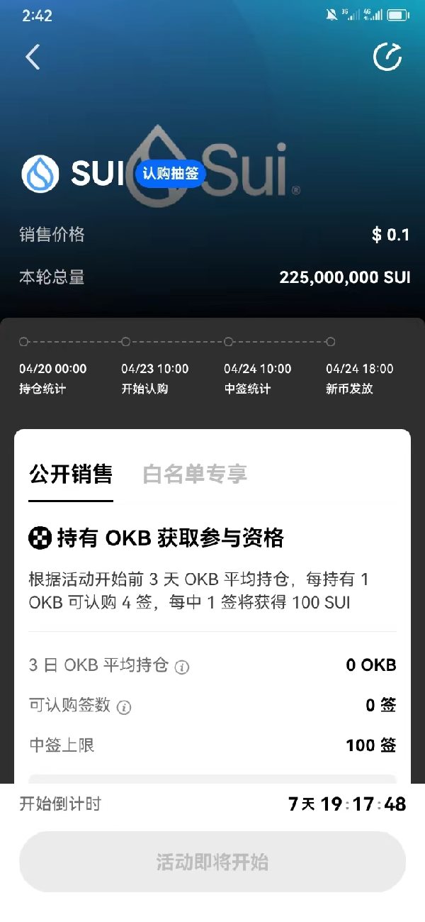 2.认购方式:计算认购日前3天(2023年4月20日-22日)平均 OKB 持仓量,每持有1 OKB可认购 4 签,每签包含 100 个 SUI,持有的 OKB 越多,可认购的签数越多。